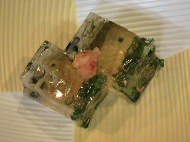 ▼小野小町コース料理。ふぐ皮煮凍り。