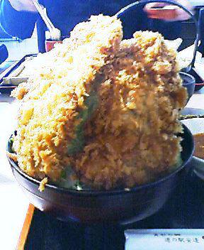 特大のトンカツが4枚、ご飯とキャベツの上で円陣を組んでます。