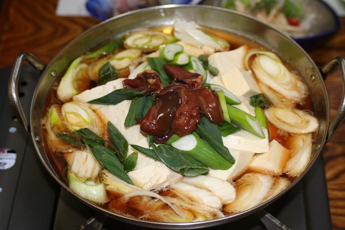 写真は4人前。やまがた地鶏の部位は「もも」「レバー」「ハツ」を使用。地元産のねぎ、たまねぎ、豆腐を使い、玉庭産の契約栽培農家の卵につけて食べます。もちろん、これは単品ではなく「やまがた地鶏料理」のコースメニュー(1人前2500円)の一つです。予約制ですので、事前に連絡をください。