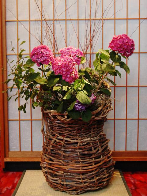 エントランスの生け花にあじさいを。