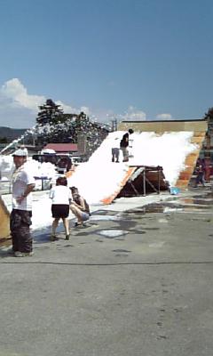 高高青竹ちょうちんまつりのイベントで真夏のスノーボードをやってます。