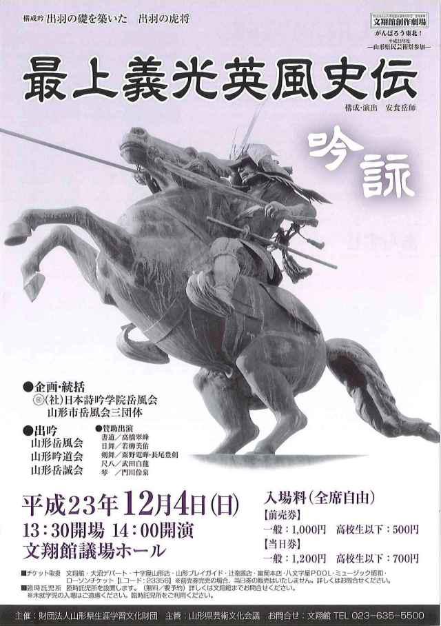☆イベントタイトルの「最上義光英風史伝」は、幕末の儒学者・塩谷宕陰が作った漢詩にちなむものですな。この漢詩では、義光を「虎将」と呼び、最上四十八楯についても触れています。