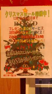 なお、20日から25日にご来店の方にBONDサンタからクリスマスプレゼントあげちゃう!!お待ちしてますぅ(^^)年内休まず営業中!!ガンバリマス!!