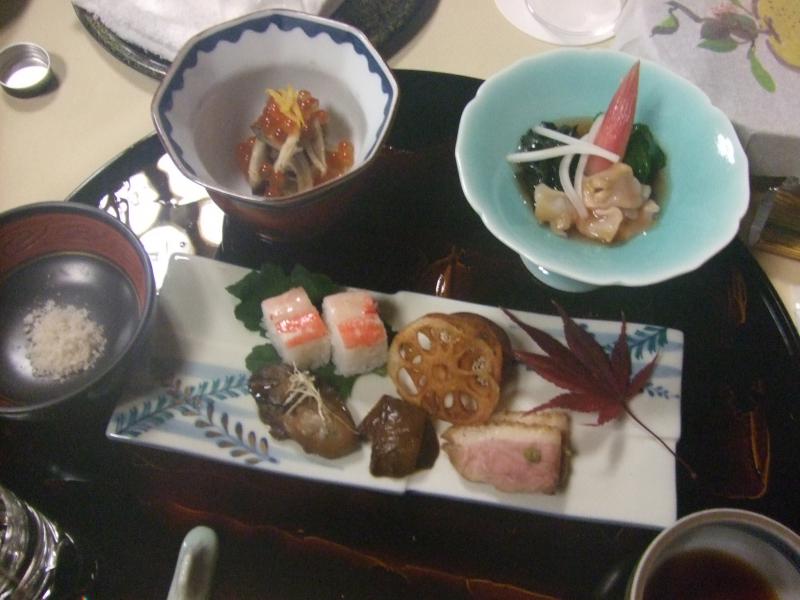 前菜 「かに寿司、鴨ロース煮、栗渋皮煮、あけび鉄火味噌和え、