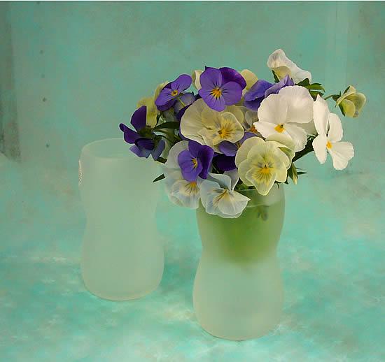 花瓶いかがですかー。こちらの花瓶は2000円です。小ぶりですがポーランド製です。厚みもあります。この花瓶を見たときパンジーを生けた姿が浮かびました。これからはパンジーが間延びしてくるので短く切り戻してしまいましょう。しばらくするとまた枝分かれして咲いてきます。短く切り戻したパンジーは切花でもとても長持ちするのでかわいい花瓶にもりもりと飾りましょう。春ならではの贅沢です。パンジーってとってもかわいい顔だね。