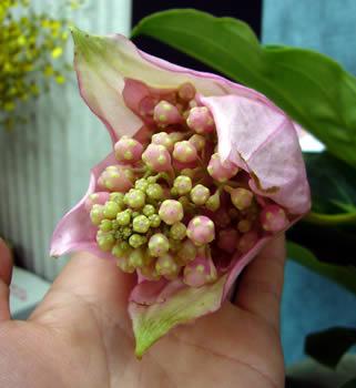 お花はこんな感じです。ちなみに外側のピンクは花びらではありません。まだつぼみの状態でこれから真ん中が垂れ下がってきます。