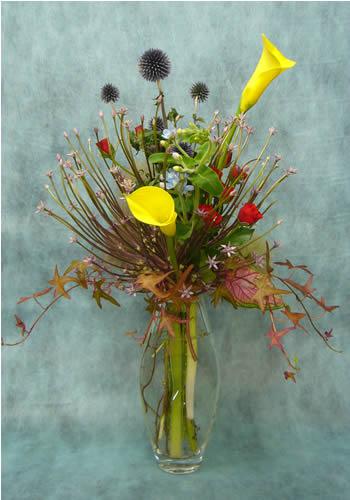 さっそく入荷品を合わせてみました。会議でお客様がいらっしゃるので、玄関用にとご注文をいただいた花瓶生けです。シュぺルティーをペースに。アイビーとカラジュームの赤い葉っぱがきいています。