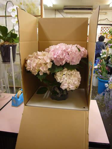 ネットショップでのご注文分です。入荷したときはつぼみでしたがその後暑い日が続き見る見る大きくなりました。こちらはアジサイ『ジューンブライド』。お花が満開になるとうすピンク。その後だんだんグリーンに変化していきます。グリーンに変化するまでまたしばらくかかります。これからが本番。たのしみー。