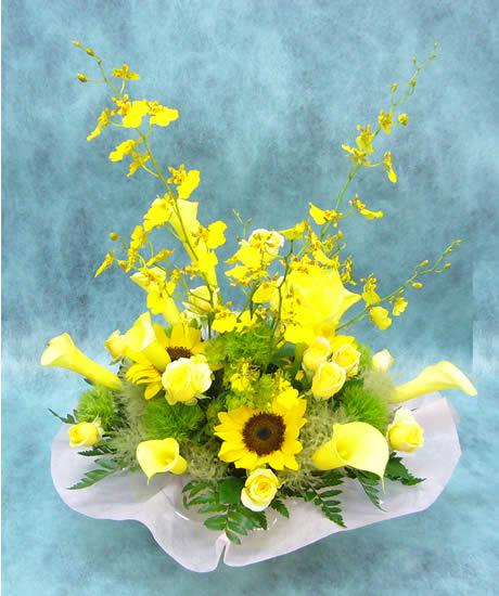 父の日用のアレンジメントです。今回は黄色のお花で作ってみました。ヒマワリ、黄色のカラー、エルムレス、ミニバラ、オンシジュームなど使用いたしました。