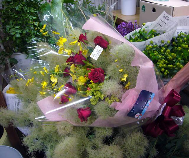 こちらは落ち着いた雰囲気の女性にプレゼント。さっそく旬のスモークツリーを使用いたしました。こちらご予算は3150円。旬の花材は品物もよくお値段もお手ごろ価格。今の季節のおすすめ花材でつくった花束です。花材はスモークツリー、赤バラ、ヒペリカム、アルケミラ、オンシジュームです。