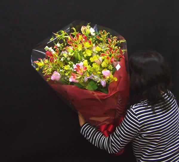 こちらの花束は10500円です。今日でお店をやめられる方へ送別のお花です。「今までおつかれさまでしたー」の気持ちを込めて華やかな花束に。いつものポーズで撮影。