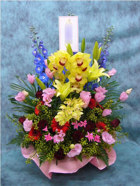 今年初めての開店のお祝いのお花です。エステのオープンのお祝いにお届けいたしました。あまりお花を置くスペースがないということで縦長にお作りいたしました。