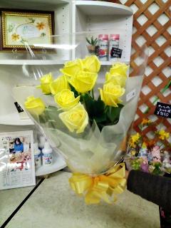 こちらの御注文はお誕生日の方への花束。男性へのプレゼントで黄色のバラでという御注文でした。本日入荷していた黄色いバラはお花が大きいタイプ。咲くととても見ごたえありますよー。あまり時間がなかったのでお届け前に携帯でぱちり。画像が小さいし、お花が大きいのでなんだか小さい花束に見えますねー。花束を抱えて撮影したら大きさがわかったかなー。