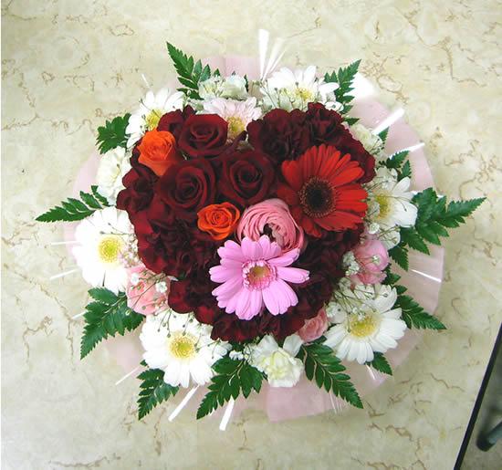 お誕生日のお祝いにハートのアレンジメント。こちらはピンクと赤がお好きな方なのでピンクのお花も入れてという御注文でした。ピンクのお花もかわいいですね〜。特に春はピンク系のかわいらしいお花が多いので、作っていてもとっても楽しいですよ!