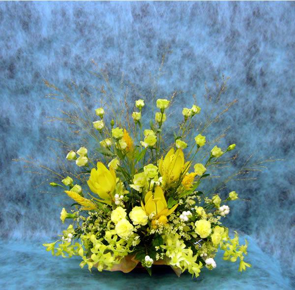 秋らしく、淡い黄色の色合いでとのご注文でお作りいたしました。4日間ご使用とのことでなるべく長持ちする花材で。イベントの会場に飾るのだそうです。