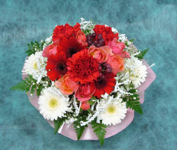 ハートのアレンジはコントラストの強い組み合わせじゃないとハートに見えないので(^-^;)、ハート部分の色は、赤以外に濃い目のピンクなら製作可能です。(赤+濃いピンクも可能)お花の種類は入荷状況により異なりますので当店にお任せ下さいね。
