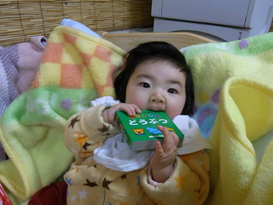 まずは寝返り。寝返りが出来るようになってから2週間たちますが、いまではころころ自由に寝返りをうてるようになりました!それとお座りが出来るようになり、一人でおもちゃで遊べるように!歯も今日6本目が顔をだしましたよ。赤ちゃん用のおせんべいもカリカリおいしそうに食べてます。ついでに絵本も・・・(^-^;)