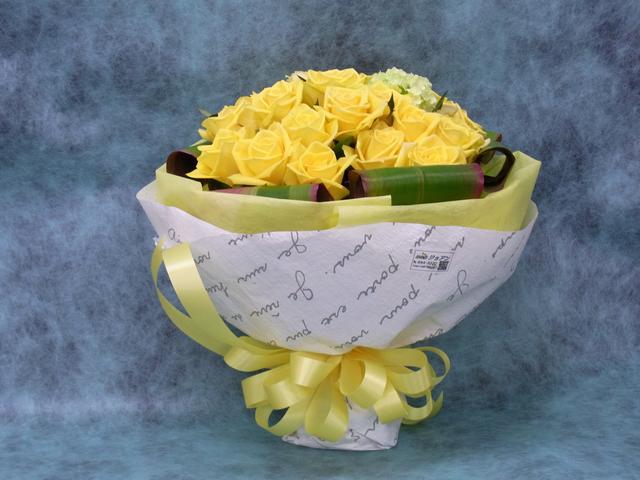 こちらはお誕生日のプレゼントにお母様から娘さんへのプレゼント。黄色いバラにグリーンをいれてとのご希望でした。コロンと可愛い花束に仕上がりました!