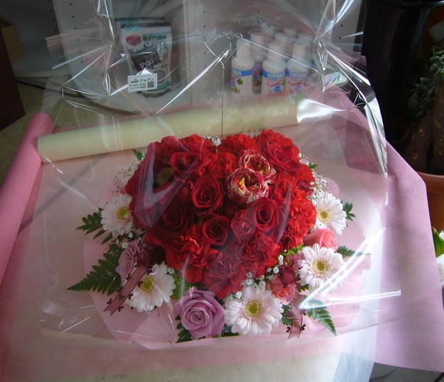 こちらはハートのアレンジメントですが、ピンクが好きな方へということで、ピンクで周りを囲みました。こちらは直径約35センチ。大きなハートです!