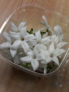 マダガスカルジャスミンです。ジャスミンもプラスチックのケースに入って出荷されます。乾燥するとしわしわになってしまいますが、ケースに入れっぱなしでもカビが生えてしまいます。茎も短いのでブーケの注文が入ったときにしか仕入れません。