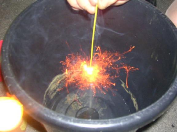 風が出てきてうまくいかなくなったので、なんとなくバケツのなかでやってみたらとてもきれいに火花が咲きました。しかも玉も落ちずに最後までできました。でも一人一人バケツに向ってかがんでいる姿は異様です。一人で楽しむ線香花火?