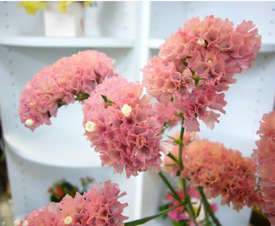 サーモンピンクのスターチスです。とてもおしゃれな色ですねー。お店でもお客様の目によくとまるようです。何気なくお花の香りをかいだらほのかにイチゴ飴のような甘い香りがしました。白いお花の部分から香りが出るのかなー。香りがあるなんてはじめて知りました。