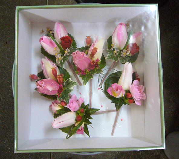 チューリップのコサージュです。3/4の結婚式でご家族の方がお使いになるということで、前日に取りに来ていただきました。よく見るとなんとなくデザインが違います。写真をとる前に箱詰めしてしまったのでちょっと見づらいかなー。
