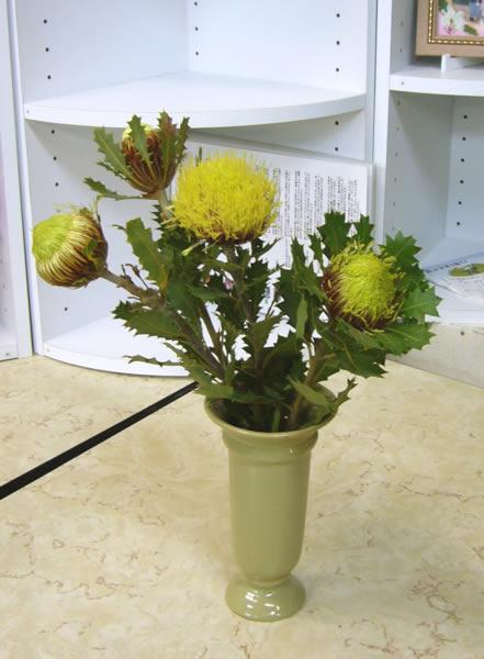クエキフォリアです。初めて入荷しました。バンクシアのなかまでしょうか。葉っぱが硬くてそっくり。つぼみは固そうに見えますが、咲くと黄緑色のふさふさになります。