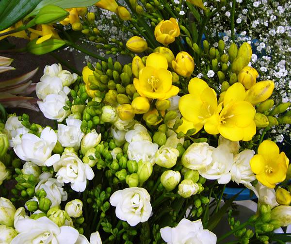 フリージアがいろいろ入荷してます。いつもの年なら2月ごろに立派なフリージアが出てくるのですが、燃料費が高くつくので今年はあまり暖房をたかないで育てられています。ということで暖かくなってきた今の時期に立派な品物が出回り始めました。今花盛りです。