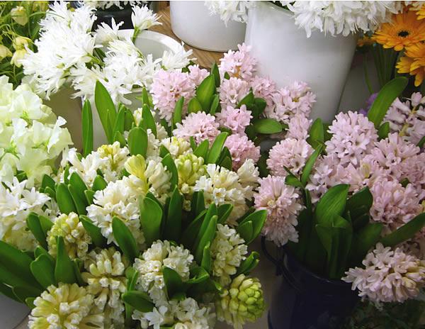 淡いピンクに白。やわらかい色合いのヒヤシンスが入荷しました。これはオランダからの輸入品です。ここのコーナーはとってもいい香りですよ。