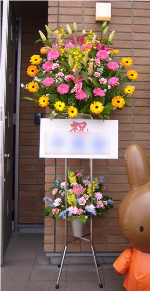 ガーベラでまん丸に生けたお祝いのスタンドフラワーです。華やかでかわいくて結構目立ちます。