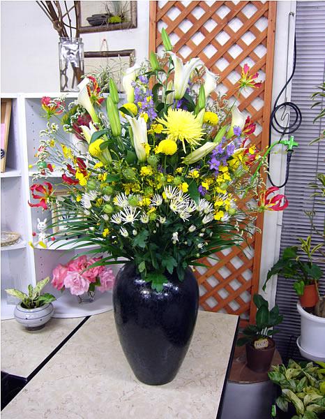 お手製のフラワーアシストを使って作ったご仏前のお花です。スターチスをワイヤーでとめて丸い形を作りそれを背景にお花を束ねました。結構大きくて重いです。お届け先では金色の花瓶に挿します。背景が白いので写真ではわかりにくいですが、実物はなんだか神々しいです。記念行事でご使用になるお花です。全国からお客様がいらっしゃるのだそうです。