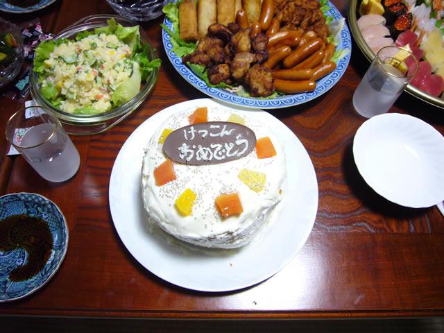 今日はだんな様の実家でお食事。だんな様の妹さん家族とお父さんお母さんと8人でにぎやかな食卓です。妹さん家族が暑い中手作りのケーキを用意してくれていました。中にもフルーツがたっぷり。仕上げの文字は妹さんのだんな様が。暑くてホイップクリームが泡立たなくて大変だったそう。全然考えていなかったのでとっても驚きました。ケーキ入刀もしました。感激(#^.^#)