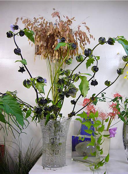 秋の風情の花材が続々入荷。こちらは黒ホオズキです。背景の植物は紅葉したコバンソウです。黒ホオズキはなかなか入荷しません。めずらしものです。普通のホオズキとは違って実かなーと思ったところから大きな紫のお花が咲いてびっくり。根元に近いほうの美はちゃんと中にタマのような実がなっているのですけどね。コバンソウもとっても素敵です。