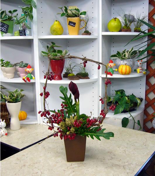 本日は道さんへお届けの日。クリスマスを意識していろいろアレンジ。黒っぽいアマリリスが入荷したのでさっそく使ってみました。おしゃれな色ですねー。サンシュを折りだめをきかせて額縁のようにさしてみました。