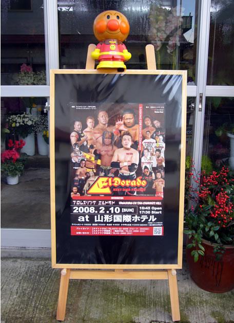 山形市江俣に1/12日オープンのプロレスショップ『ダノイアヴォイ』さんに開店祝のお花をおとどけしてきました。ということでお届け先お店紹介。なんですけどお店じゃなくて試合のご案内でーす。優しくて強い人たちというイメージでアンパンマンを飾り付けてみましたー。