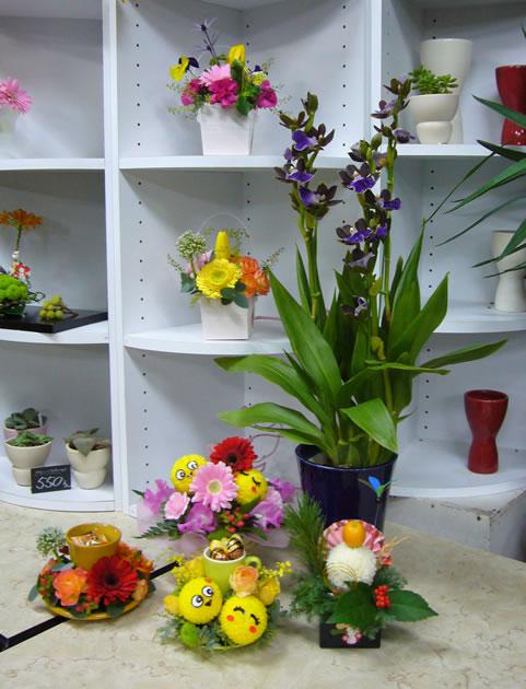 今回の鉢物市でジゴペタラムを入荷いたしました。3150円です。なかなかきれいですよ。今は贈答品の季節ではないのでお買い得価格となっております。一緒に店内に並んでいるアレンジも撮影いたしました。