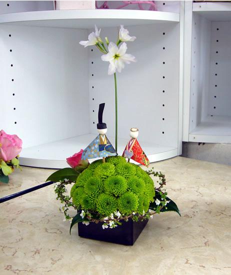 グリーンのミニピンポン菊で山を作ってお雛様を飾ってみました。お雛様も手作り。紙粘土と和紙で作りました。細かい作業なのだー。シックなお雛様は和菓子をイメージして作りました。和菓子ってシンプルなのにそれらしく見えるのですごいなーっていつも感心していたのでちょっとまねしてみたつもり。シンプルで落ち着いた大人のお雛様です。