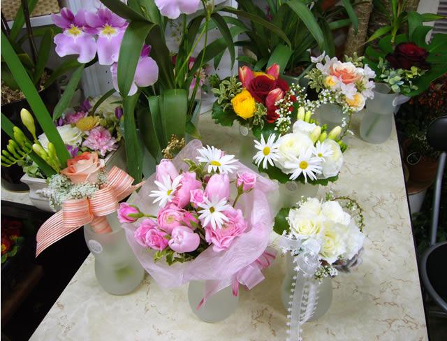 3/14はホワイトデー。3月は何かとあわただしくて忘れてしまいがちですがあっという間にバレンタインデーから1ヶ月がたちました。今年はお花のお返しなんてどうでしょう?さりげないかわいいミニブーケが人気です。もちろんボリュームが欲しい方は普通サイズの花束で。ご希望の色、ボリュームなどをお伺いしてお作りいたします。ただしブルー系の花今現在は在庫がありませんねー。