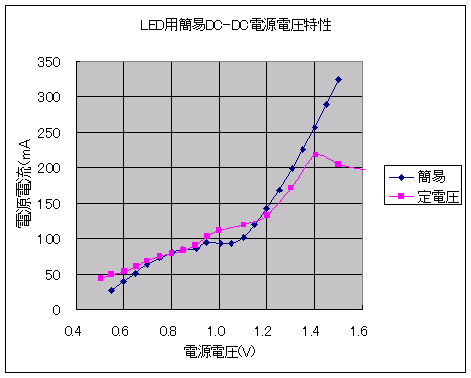 ▼白色LED点灯用簡易DC-DC>定電圧動作との比較