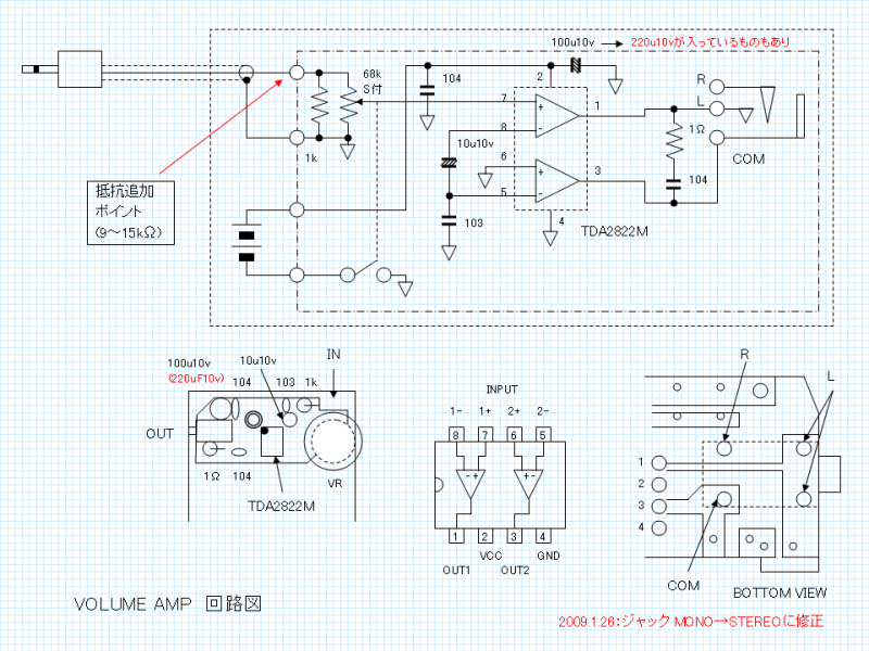 (回路的には・・・VR自体の抵抗低いものを使用(1〜5kΩ位)し、直列に抵抗入れる(10〜47kΩ位)だけでいいはず。現状、入力に並列に1kΩの抵抗入っているけど・・・)