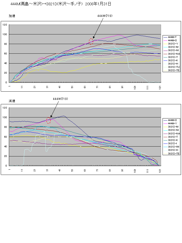 また米坂線ような旧国鉄型気動車の場合、エンジン噴かしてもすぐには車両が動き出しませんが、本データは速度が1km/hを超えた所を基点にプロットしてます。