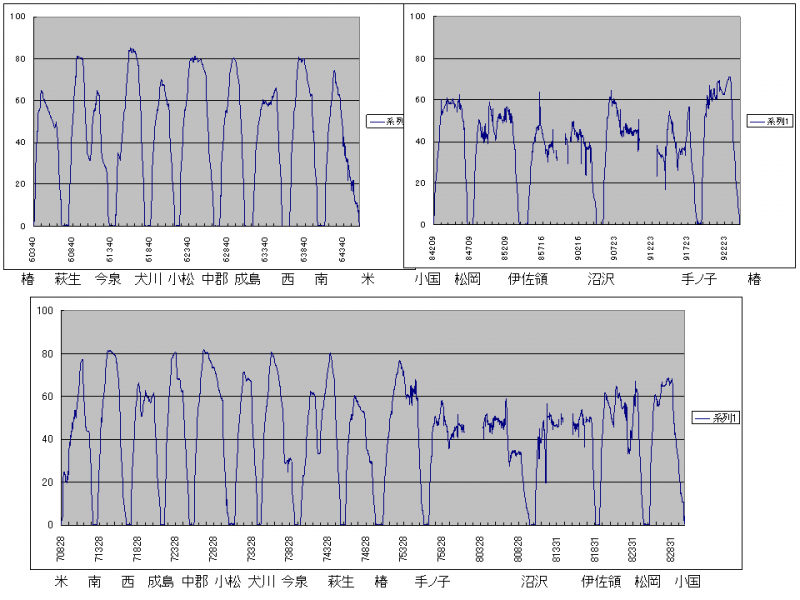 平野区間である米沢〜手ノ子間は最高80km/h位ですが、山岳区間である手ノ子〜羽前松岡間は60km/h位に抑えられているようです。