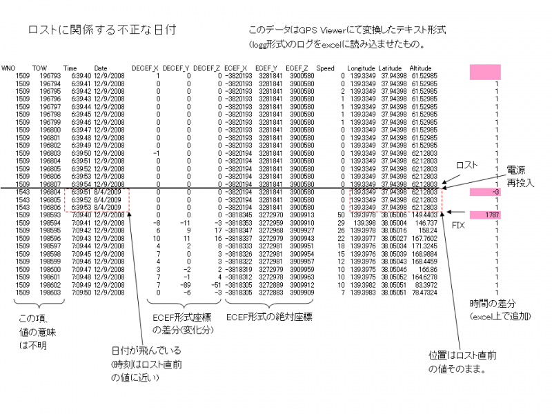 GPS Viewerにてログを出力(手順は下記参照)させるとメモリ上のログがすべて出力される事がわかり、それを使って出力したロスト前後のログが図のデータである。
