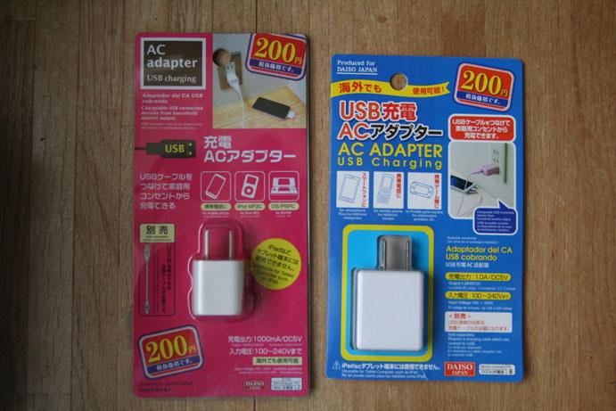 AC電源よるUSB充電アダプターが、ダイソーから発売されている。