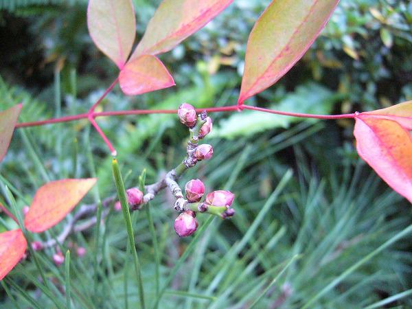 【写真】 難を転じる南天の葉と、緑の松と梅のつぼみです。