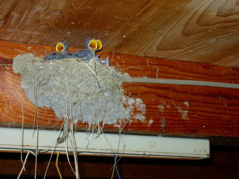 私のうちに、今年3回目の雛が孵っています。親鳥が来た時はピ〜、ぴ〜!って、凄く賑やかなんですよ。一日に何回餌を運んでいるんでしょう? 100回いやいや200回位帰ってきています。それは、お父さんかお母さんか判らないけど、3羽いるように感じるんですよ。前回孵ったお兄さんかな? それともお父さんかお母さんの愛人かな?・・・三角関係かな? でも、ツバメの大人たちみんなで力を合わせていますよ。 餌運びは、お父さんだけがしているのではないですよ。