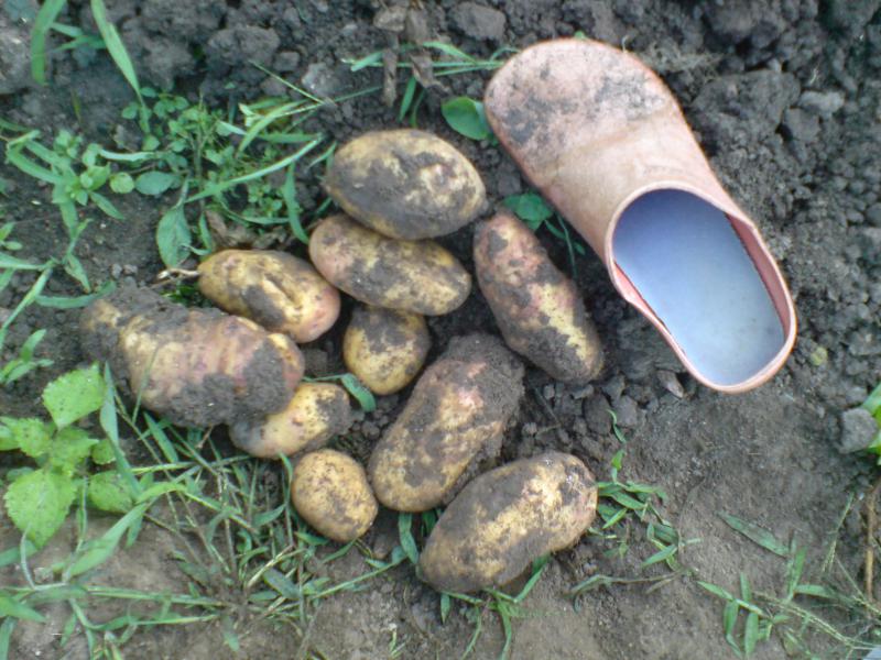 さて今週南ドイツはカンカン照りで気温も30度近く。暑い日中を避けて、今朝も7時から畑で収穫です。写真はジャガイモ。一つの株からこれだけ採れました。赤いサンダルはガルテングロッグという履き物で、大きさは25cmぐらいでしょうか。すごい大きなジャガイモでしょう?今夜はこれを丸ごとフォイル包み焼きにしてのごちそうです。