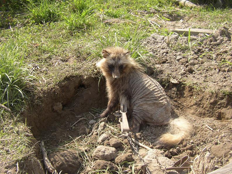 罠をかけた翌日(20日)、痩せたタヌキがかかっていた。