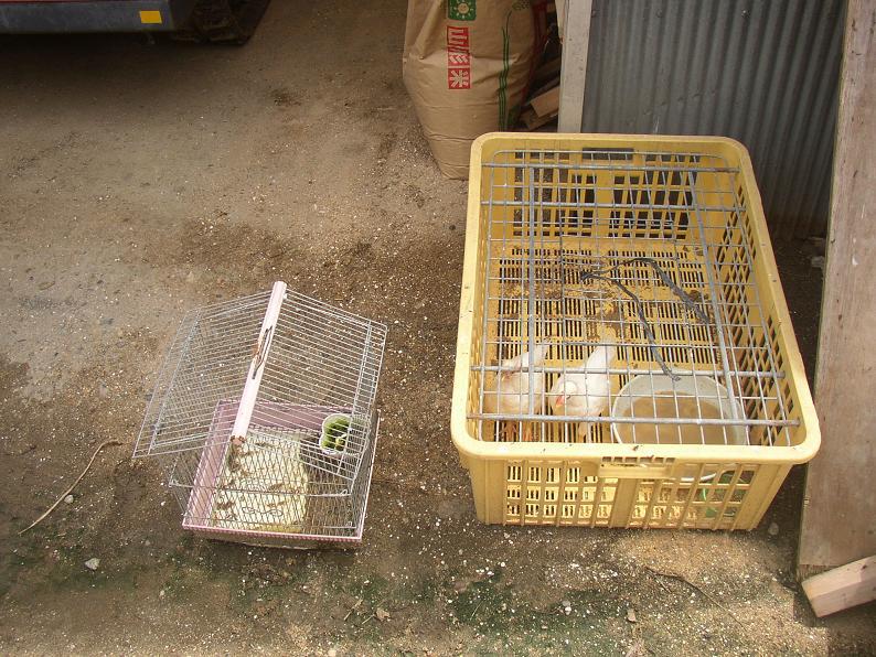 朝起きて、何気なく道路わきに止めてあったトラックを見たら、荷台に鳥かごらしきものがあり、中で何かが動いている。なんだろうと思って近づいてみると、生まれて40日ぐらいの二羽のニワトリが入れられていた。息子に聞いてみても知らないという。では・・どうしてここに・・・?・・捨て子か!・・・捨て鳥だ。